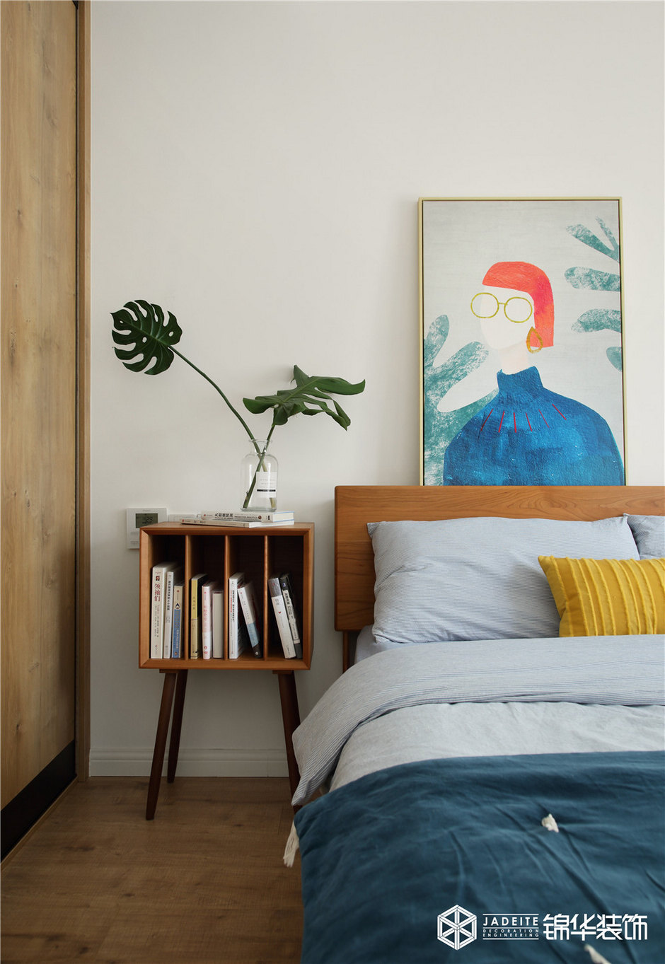 ▲臥室頂面和墻壁刻意保持干凈,藝術(shù)感的裝飾畫和恣意舒展的龜背竹給予空間一種簡(jiǎn)潔、童趣和復(fù)古的調(diào)性!