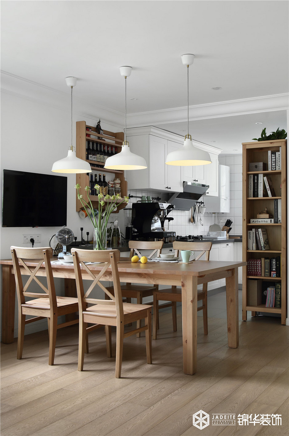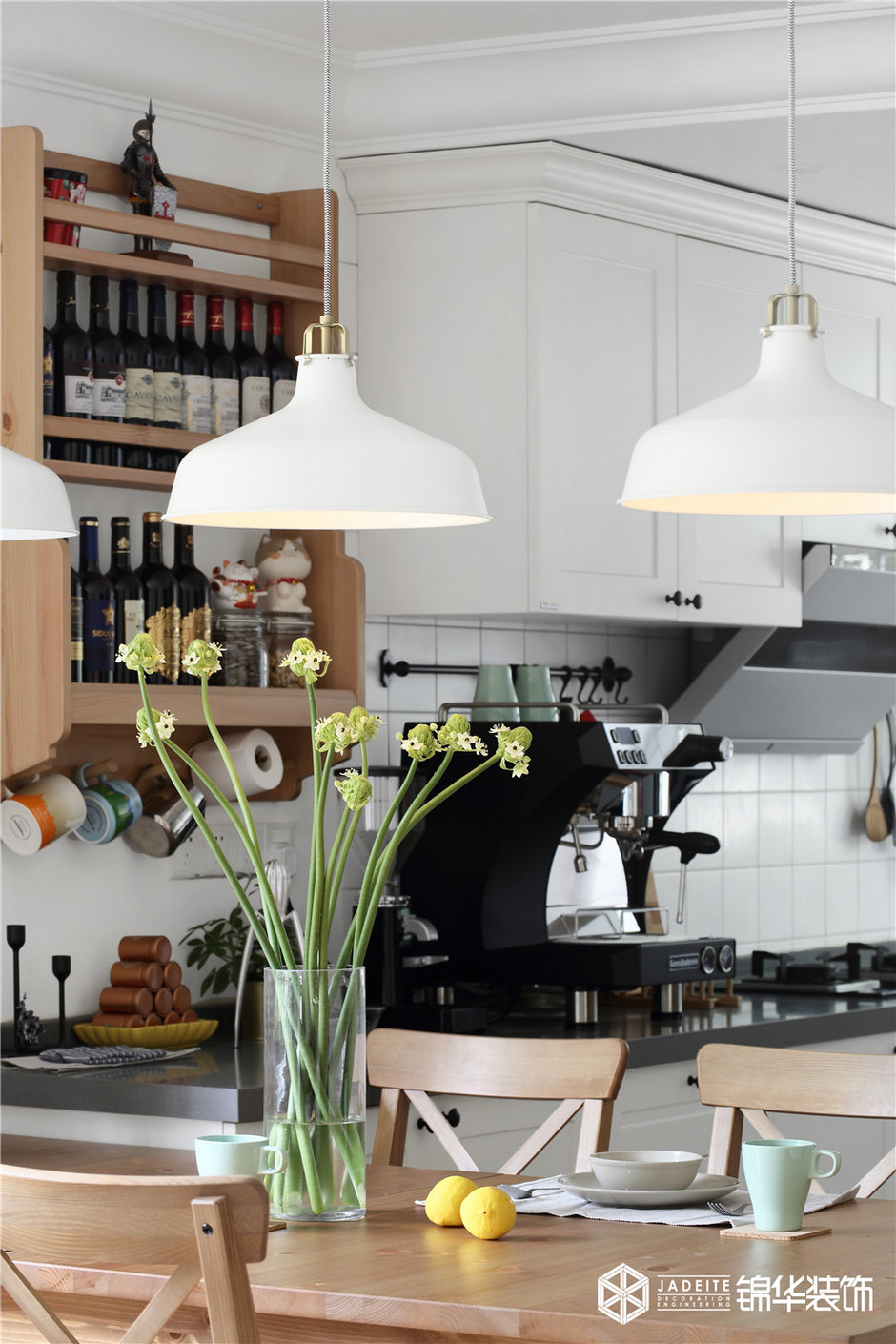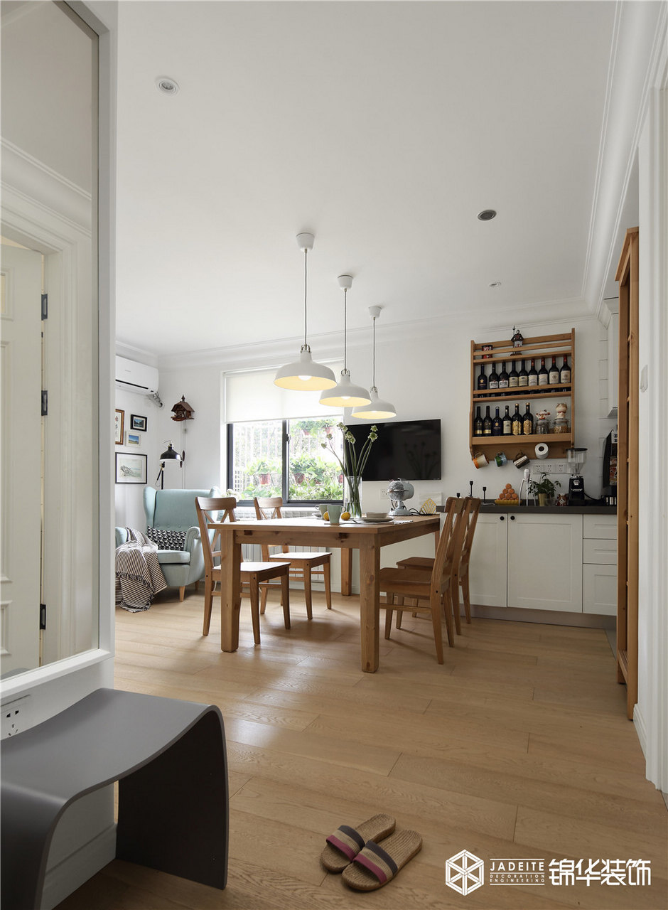 ▲餐廳很簡(jiǎn)單,一張桌子兩張椅,白色的吊燈灑落一桌燈光,溫暖了歸人的心!