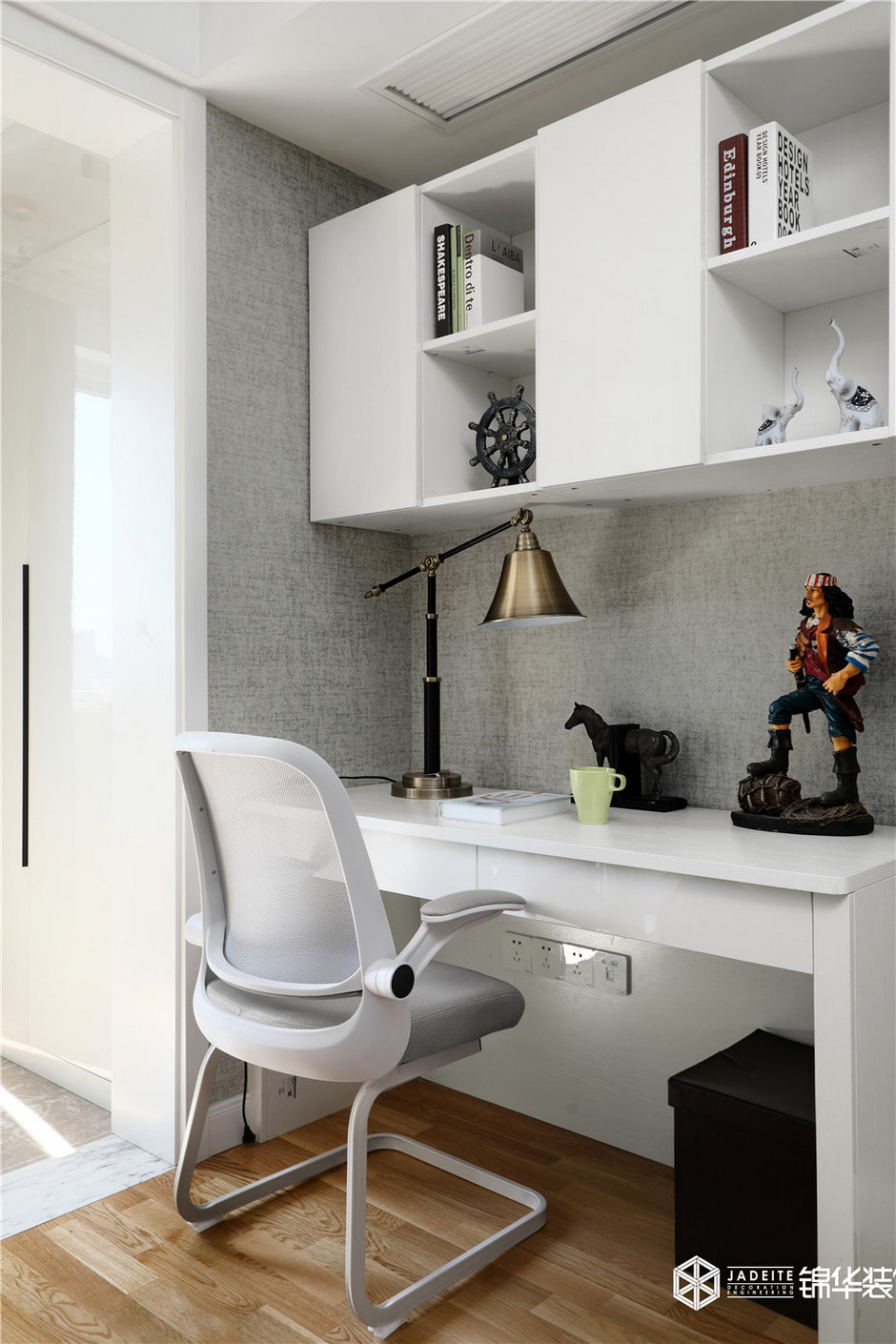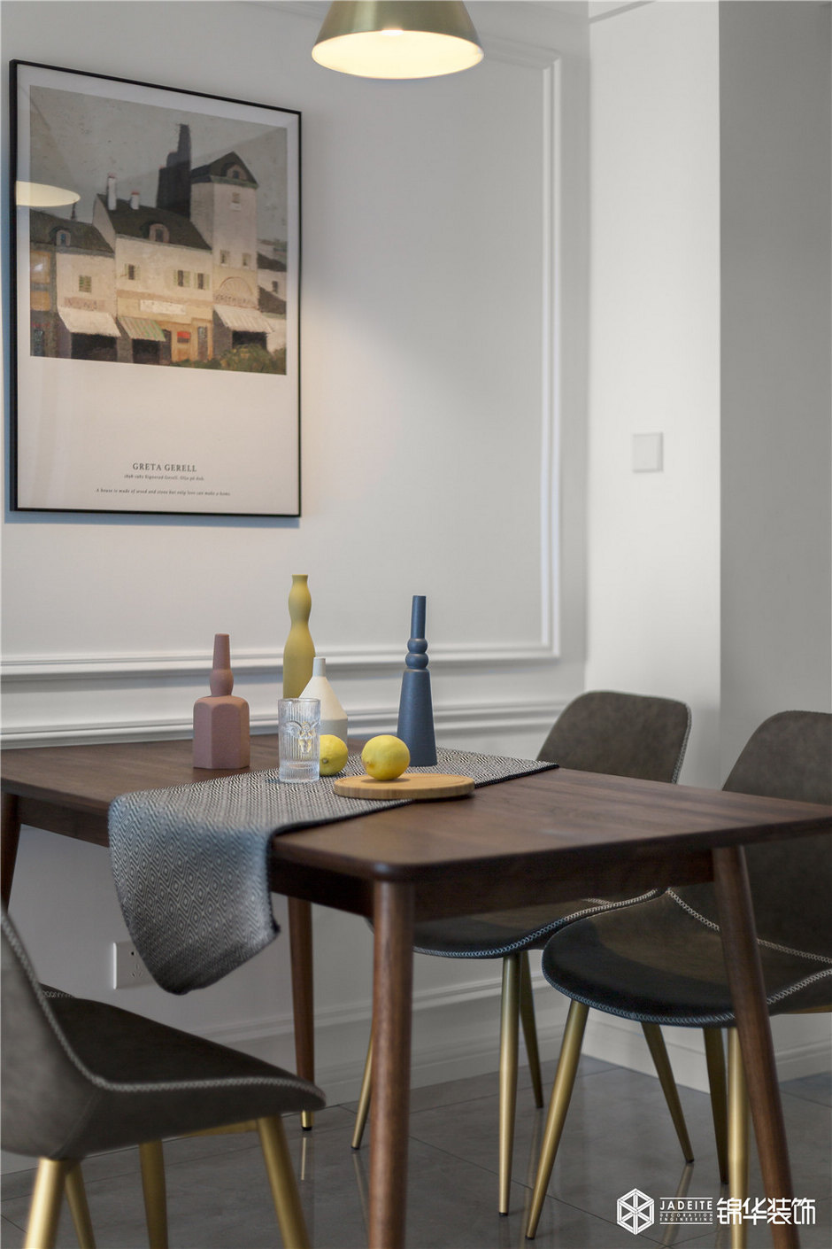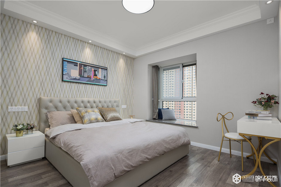以pu線條代替造價(jià)甚高的護(hù)墻板,將其直接貼于墻面,增加了空間的層次感,其余的地方則是用不同色彩的墻紙?bào)w現(xiàn)空間的活潑性,呈現(xiàn)出空間本身的質(zhì)感與美感,白色和灰色的組合又使得整個(gè)空間安靜又舒適。