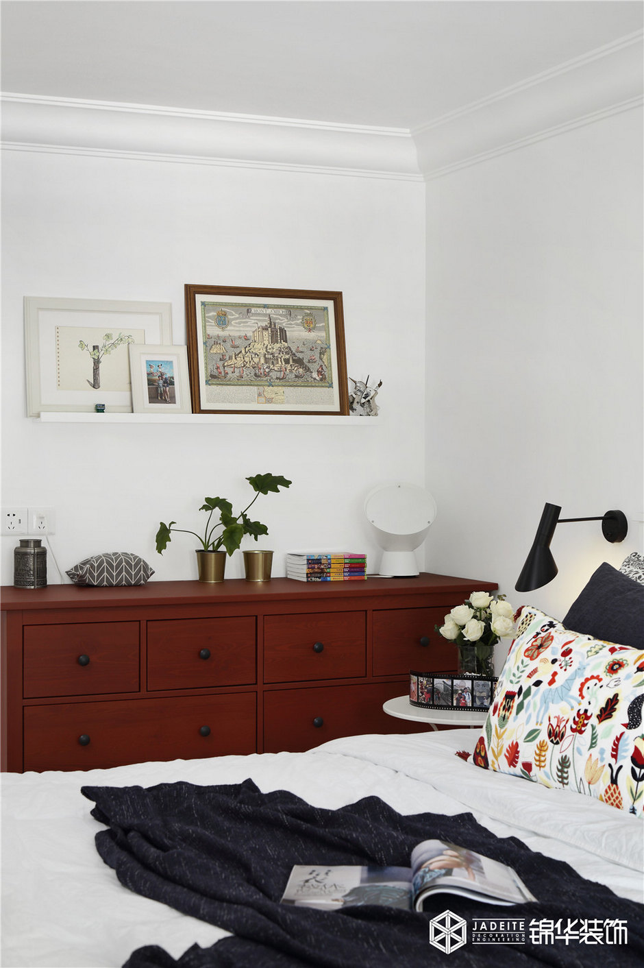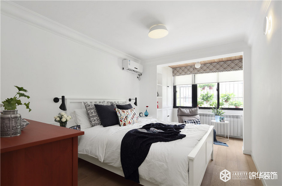 整個(gè)臥室空間以白色調(diào)為主,輔以恰到好處的醬紅色、木色等,再搭配以其他裝飾品等,讓整個(gè)空間看起來既寬敞舒適又格調(diào)十足。