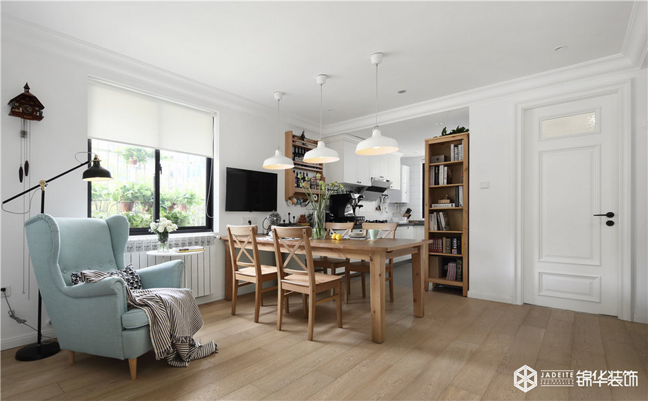 客廳以清新的白色護(hù)墻板搭配溫馨的米色墻紙,豐富了整個(gè)空間層次。電視背景墻處做了一扇隱形門,使得整個(gè)空間更加具有完整性和對(duì)稱性。