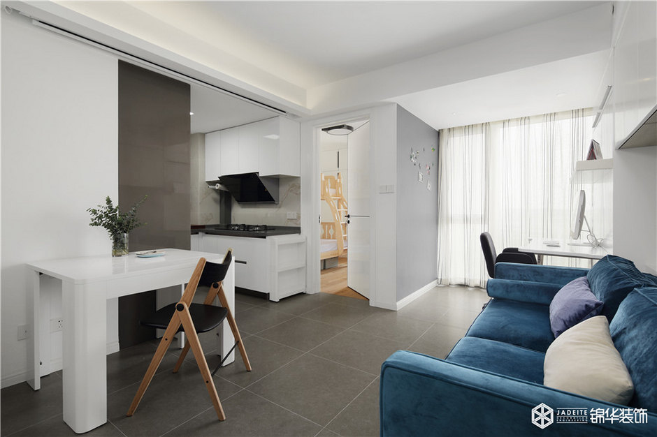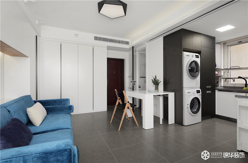 雖然本案是一個(gè)只有50平的公寓,但該有的功能全部具備,比如大型綜合儲(chǔ)物柜、全景書房、觀景飄窗閱讀臺(tái)、強(qiáng)大功能的廚房。