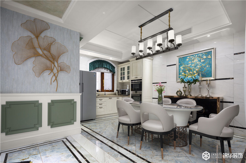 靠近餐廳的墻上,采用了別致的銀杏葉掛件,既富有文藝氣息(符合業(yè)主本身的文藝調(diào)性),又律動(dòng)感十足,讓人移不開眼。